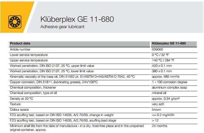 KLüberplex GE 11-680是一种矿物油基和铝复合皂稠化润滑油胶粘剂。它是耐高压、含抗磨添加剂,腐蚀和氧化抑制剂。KLüberplex GE 11-680是沥青,溶剂和含有铅的原料。