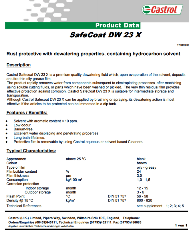 具有脱水性能的防锈保护剂,含烃溶剂 描述 嘉实多SafeCoat DW 23 X是一种优质脱水液,随着溶剂的挥发,存款超薄油膜。 该产品迅速去除水从组件后的电镀工艺,加工后 使用可溶性切削液或已被清洗或酸洗的零件。非常薄的残余膜提供 有效防护腐蚀。Castrol Safecoat DW 23 X适合中级存储运输。 Castrol Safecoat DW 23 X可采用刷涂或喷涂应用,其脱水作用最 有效的,如果要保护的物品可以浸在浸槽中。 功能/效益: 与芳烃含量<10 ppm的溶剂。 低气味。 无钡。 优良的水驱替和渗透性能长浴寿命。