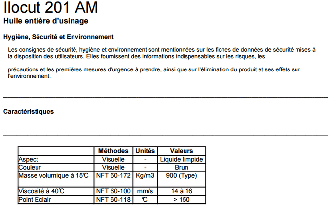 全油加工 描述 ILOCUT 201 AM是流体,压力和质量的极端雾灯。 应用 剃须和切齿。 削速度低。 -易切削钢不锈钢和超软。 钻孔,攻丝螺纹钢和难加工材料。 性能 产品提供了一个方便使用的雾 除氧性能优良。 性使用。 非常良好的润湿性,使冷却 快速工具 批准:z000230532 PSA 批准:z000163207 PSA 用于加工质量的极端压力的 材料的切削加工性差。 存储 建议储存包下。如果存储桶外,应 涂布和存储水平,以避免可能的进水口和删除标识产品。 ilocut 201。 全油加工 健康,安全和环境 的安全,卫生和环境应提供安全数据表更新 提供给用户。他们提供必要信息的风险, 预防和早期的应急措施,以及对产品的处置及其影响环境。