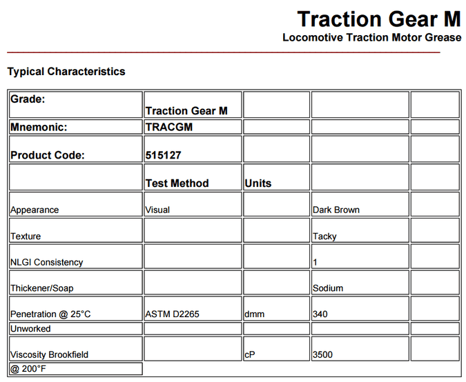 NABORS BLUE EXTRA HD GEAR LUBE 80W-90 NABORS BLUE EXTRA HD GEAR LUBE 85W-140 Traction Gear M 机车牵引电机润滑脂 健康、安全与环境牵引齿轮M是钠皂稠、粘性 特别配方的齿轮润滑油,以保护轴挂式机车牵引电机的齿轮 和其他重型电力推进系统。牵引齿轮M形成一个坚韧的油膜,不会破裂 在严重的齿轮齿载荷。这种润滑脂具有极好的抗氧化性能 它可以在极端条件下工作温度和负荷在长时间没有 显著恶化。本产品已专门制定设计粘度法 在高环境下防止过多的密封泄漏运行温度,同时确保它不会低温通道。 牵引齿轮M已被专门设计为机车动力推进的润滑 系统-特别是牵引齿轮电机。它是由通用电气批准他们的 规范通用电气d50e8c齿轮润滑油 -在很宽的范围提供良好的齿轮保护