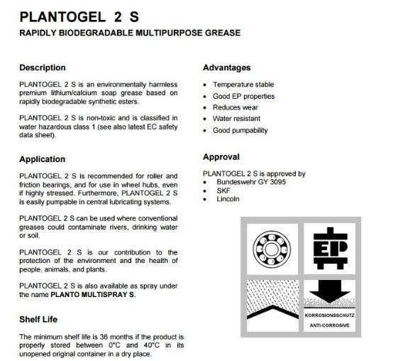 PLANTOGEL 2 S推荐的平原和滚子轴承,即使高度强调。 PLANTOGEL 2 S,可以使用正常的多用途或EP润滑脂由可生物降解的产品,应及时更换。 通常在传统的油脂可能会污染河流,饮用水水体或土壤。