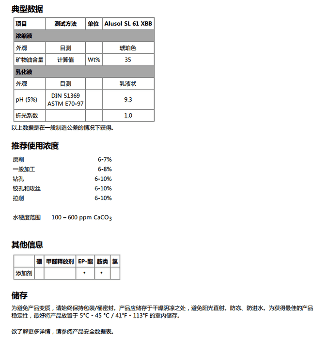 高性能半合成金属加工液 产品说明 嘉实多 Alusol™ SL 61 XBB(原名 Alusol RBF)是一款高性能半合成金属加工液,不含硼、不含氯、不含甲醛释放剂。该 产品所含的添加剂组合,有助于提升加工性能并改善表面光洁度。同时本产品具有极佳的产品稳定性,有助于降低总体运营 成本。 Alusol SL 61 XBB 适用于大型中央系统和单机系统。 应用 Alusol SL 61 XBB 特别推荐用于铝合金加工。同时也可用于黑色金属的加工。 推荐的核心应用 可能的应用,请在使用前咨询嘉实多代表 产品优点 更长的使用寿命,有助于减少检修停机时间。 低泡。(在建议的水硬度条件下) 特别设计的润滑组合有助于延长刀具寿命,改善铝加工时的表面光洁度。 出色的润湿性有助于减少切削液的带走量,并保持机床和工件的整洁。 不含硼,符合特别注明不含硼的废弃物处理相关规定的要求。 不含氯、不含甲醛释放剂、不含亚硝酸盐,符合当地法律法规的要求以及废弃物处理的有关规定。
