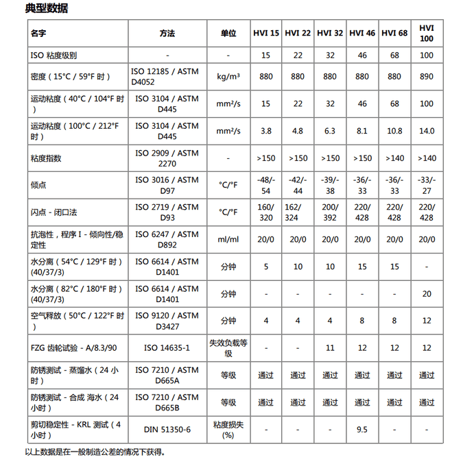 CASTROL Hyspin HVI 22 CASTROL Hyspin HVI 32 CASTROL Hyspin HVI 46 CASTROL Hyspin HVI 68 CASTROL Hyspin HVI 100 高粘度指数抗磨液压油 产品说明 嘉实多 Hyspin HVI 高粘度指数 (VI) 润滑油系列基于精心挑选的无灰(无锌)添加剂系统,旨在满足并超越最严格的性能标准。 应用 Hyspin HVI 润滑油专供要求高水平抗磨性能和精滤性能的高压的液压系统使用。 此外,Hyspin HVI 具有卓越的腐蚀保护 性能以及杰出的氧化和 热稳定性。 Hyspin HVI 具有卓越的水解稳定性,可以很快将油中的污染水迅速分离出来。 Hyspin HVI 含有剪切稳定的添加剂系统,即使在超过使用寿命后,也可帮助产品在广泛的温度范围内保持很好的粘度特性;并且本 产品还具有非常低的倾点,使产品在严寒环境中仍可使用。 对于丁腈、硅胶和氟化聚合物(例如氟橡胶)等常用于静态和动 态密封的弹性材料,Hyspin HVI 系列产品与其完全相容。 应用 在宽泛温度范围内作业的户外设备,例如需要 冷启动和在高温下连续运行的机械。 例如非公路机械和船舶应用等。 内置控制系统要求粘度变化受温度影响最小的室内制造设备。 例如精密机床等。 Hyspin HVI 的分类如下: DIN 51502 类别 - HVLP ISO 6743/4 - 液压油类型 HV Hyspin HVI 级别符合以下标准的要求: DIN 51524 第 3 部分 Cincinnati Lamb (Milacron) P 68-69-70 Denison (Parker Hannafin) HF-0 US Steel 126 & 127 Eaton I-286-S & M-2950-S Frank Mohn 产品优点 高粘度指数和低倾点使得产品可以在广泛的温度范围内使用。 良好的剪切稳定性意味着粘度不会因机械剪切而有过 多损失。 卓越的抗磨性能可为液压泵提供更长时间的抗磨保护。 减少因非计划维护而产生的停机时间,节省零部件替换的成 本。 出色的水分离性和水解稳定性,可延长润滑油使用寿命并提升设备可靠性,从而减少停机时间。 出色的氧化和热稳定性能提供可靠性能,并延长润滑油在恶劣应用中的使用寿命。 可有效减少沉淀产生,从而提升 系统清洁度并降低过滤器更换频率。 出色的过滤性(包括在有水的情况下)可提高过滤器使用寿命,从而降低成本。