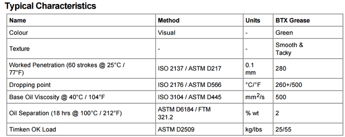CASTROL BTX Grease 高性能油脂 描述 嘉实多BTX™油脂用于范围广泛的矿业和工业的高性能润滑脂 应用.BTX润滑脂使用独特的极压抗磨剂的组合,腐蚀 在锂基复合物基中的氧化抑制剂。 应用 BTX油脂借鉴一些严重的重型应用,包括赛车场审判经验。这个 配方设计,以提供出色的保护球和滚动轴承在高速和负载 应用.它也适用于通用底盘润滑,球关节,等速万向节和其他滑动 表面和滑动轴承润滑。它也用于杰克轴、斗销、振动轴 连续工作温度范围:- 35℃至175℃ 间歇工作温度范围:- 40℃至200℃ 优势 结合优良的极压性和粘附性能优于高温稳定性 传统的不设防的润滑脂。它有一个非常高的下降点,是适用于广泛的经营 温度. 耐水性,并包含一个强大的缓蚀剂,以保护润滑的机械部件在潮湿的 条件.BTX高油脂的特性让它被推荐为最 艰苦的条件。 工程,以最大限度地提高设备的耐久性在不同的应用范围。
